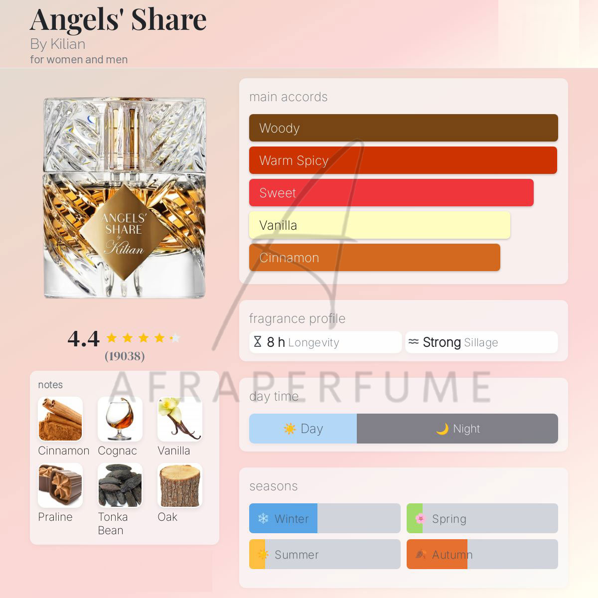 عطر ادکلن بای کیلیان آنجلز شیر | By Kilian Angels’ Share مناسب فصول سرد سال مانند پاییز و زمستان می باشد.همچنین این عطر با رایحه محبوبی که دارد برای طول شب و محافل شبانه مناسب می باشد.