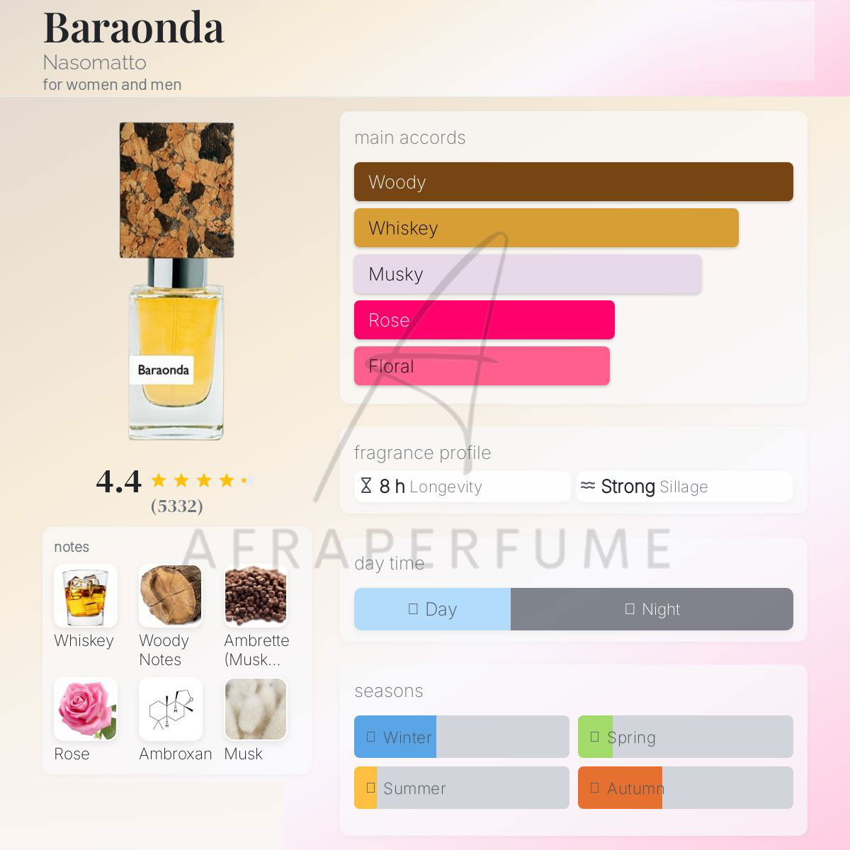 عطر ادکلن ناسوماتو بارا اوندا-Nasomatto Baraonda، عطری است گرم، تلخ، میوهای و چوبی که شروعی گرم و الکلی مانند از رایحه ویسکی و حسی نیمه شیرین و میوهای مانند دارد که رایحه ضعیفی از گلها نیز با آنها ترکیب شدهاند.
