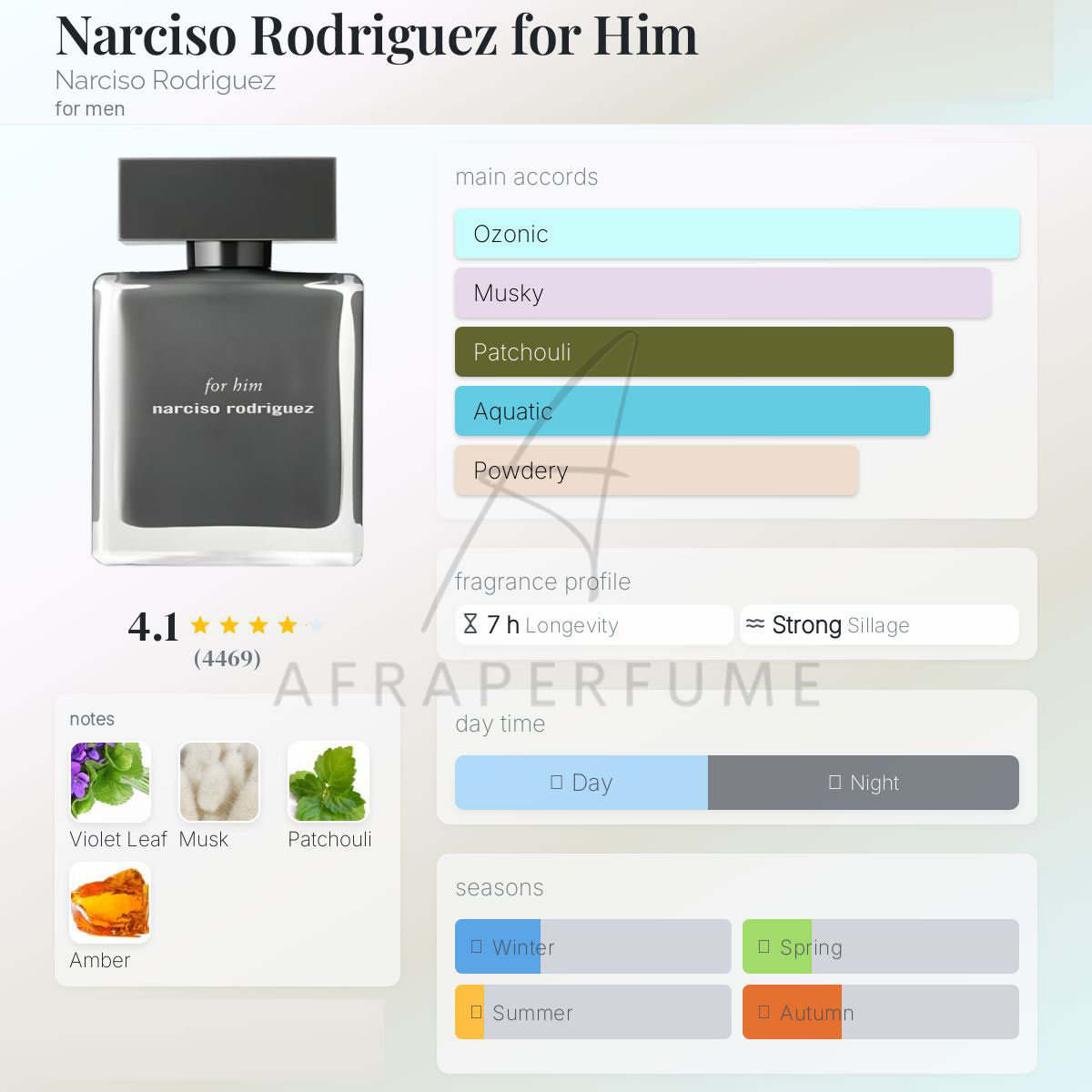 عطر ادکلن نارسیس رودریگز فور هیم-Narciso Rodriguez for Him مناسب فصول پاییز و زمستان میباشد.همچنین بهتر است در شب و مجالس رسمی مورد استفاده قرار گیرد.