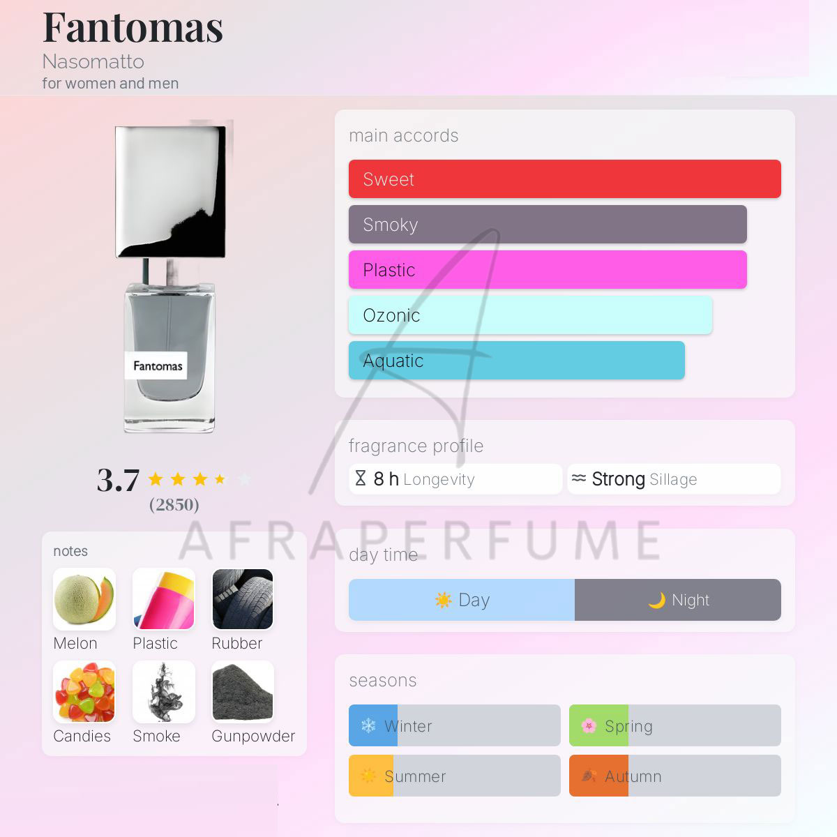عطر ادکلن ناسوماتو فانتوماس | Nasomatto Fantomas مناسب تمامی فصول می باشد.همچنین این عطر با رایحه محبوبی که دارد برای طول روز و محافل روزانه و شبانه مناسب می باشد.