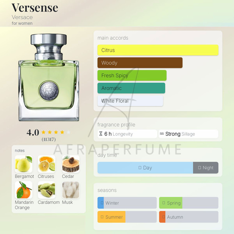 عطر ادکلن ورساچه ورسنس-Versace Versense مناسب فصول گرم سال یعنی بهار و تابستان می باشد.همچنین بهترین گزینه برای طول روز و محافل روزانه است.
