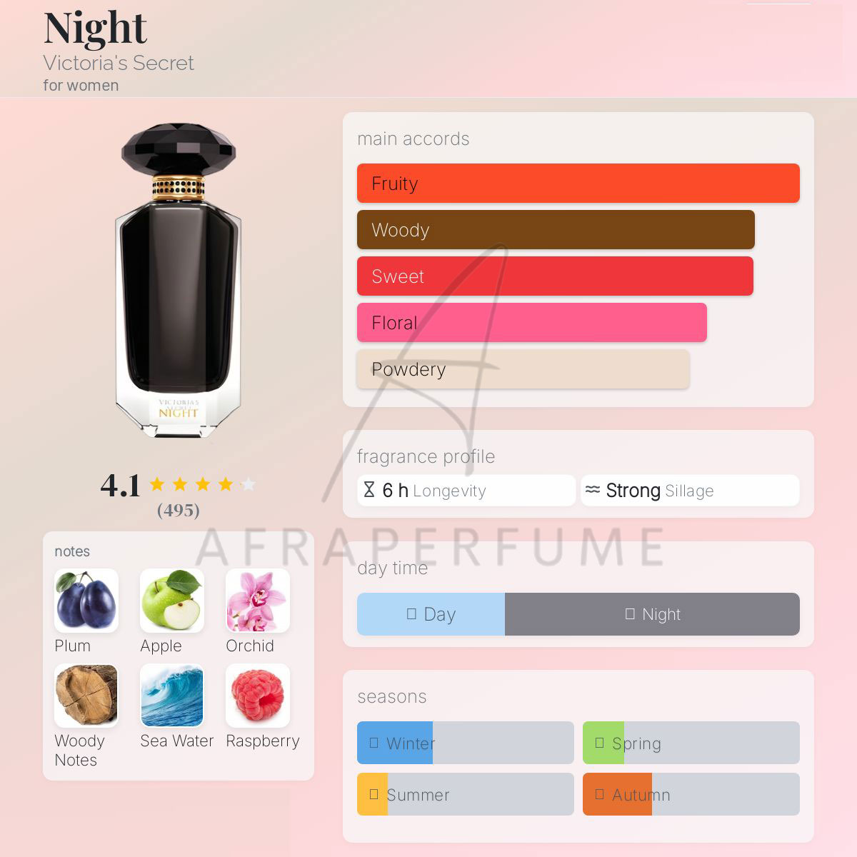 عطر ادکلن ویکتوریا سکرت نایت-Victoria Secret Night مناسب فصول سرد سال یعنی پاییز و زمستان می باشد.همچنین بهتر است در شب و در مجالس رسمی مورد استفاده قرار گیرد.