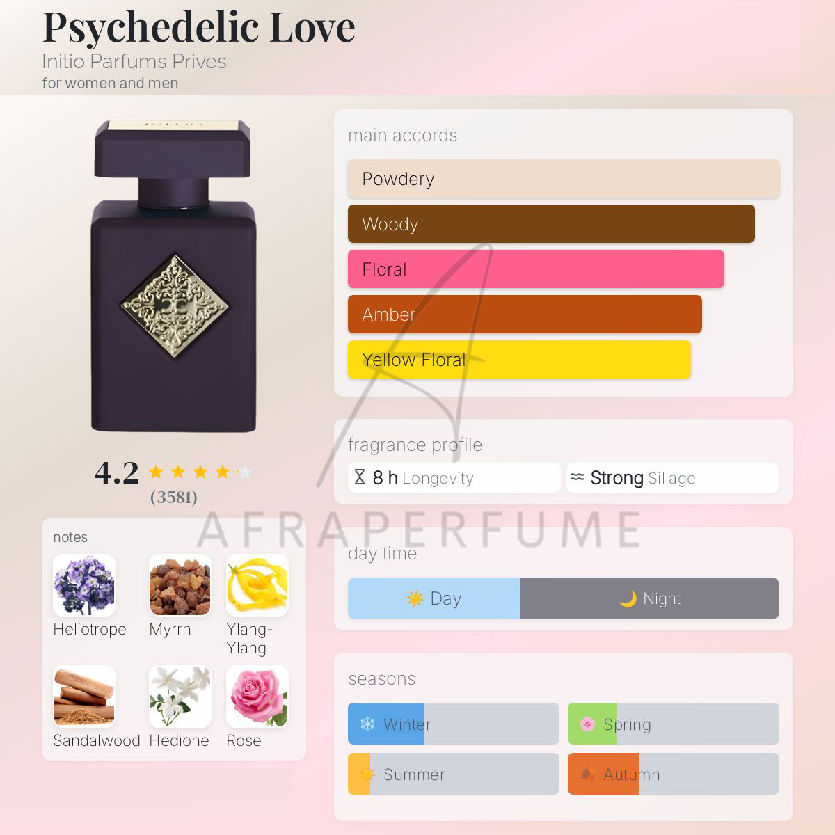 عطر ادکلن اینیشیو سایکودلیک لاو-Initio Psychedelic Love برای فصول سرد یعنی پاییز و زمستان مناسب می باشد.همچنین بهتر است در شب و در مجالس رسمی مورد استفاده قرار گیرد.