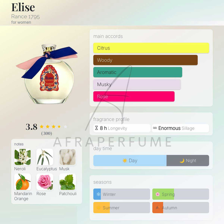 عطر ادکلن رنس الیزه-الیس | Rance 1795 Elise عطری است ملایم .این عطر در سال 2012 به بازار عطر و ادکلن عرضه شد. عطر ادکلن رنس الیزه-الیس-Rance 1795 Elise عطری است زنانه و لاکچری.