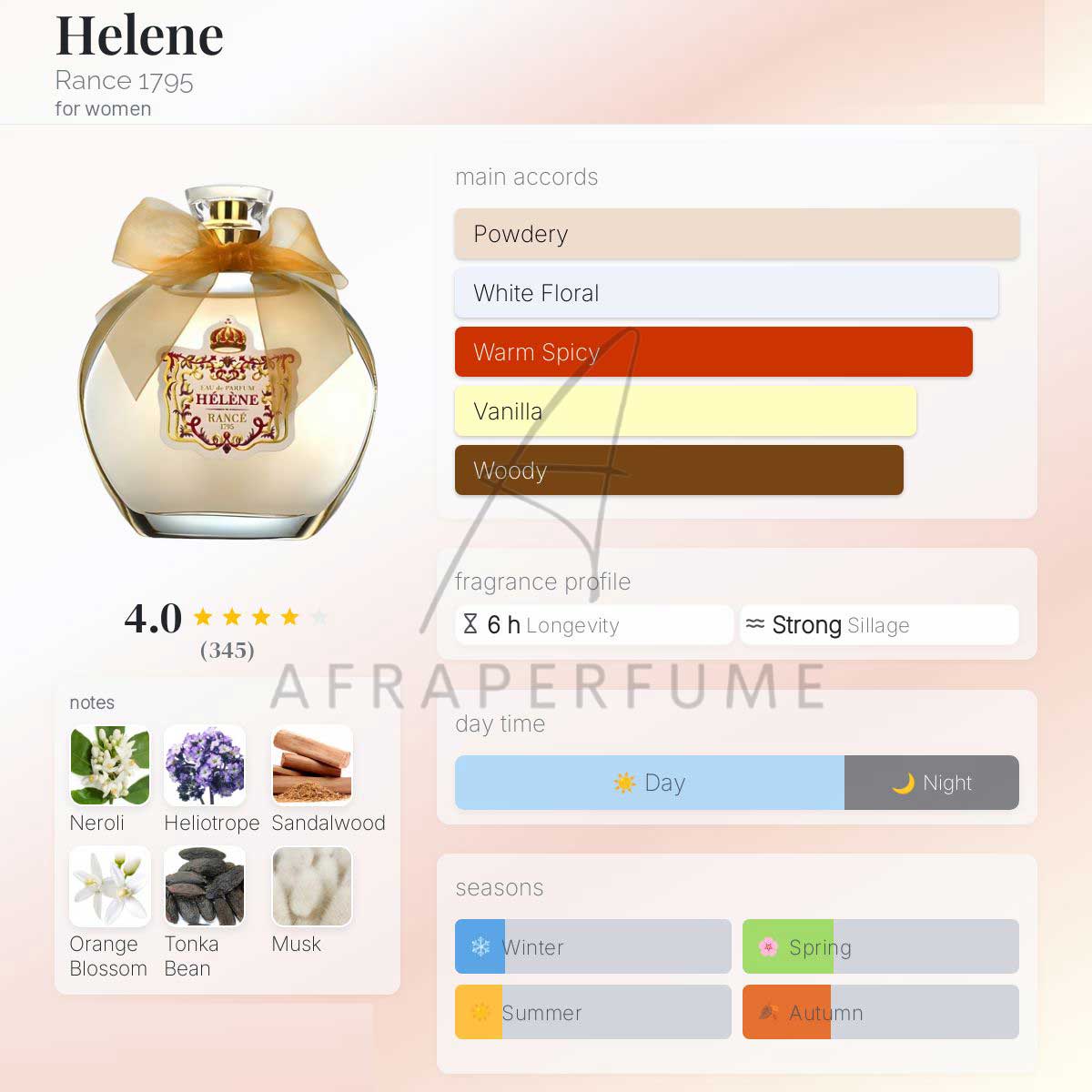 عطر ادکلن رنس هلن-Rance 1795 Helene عطری است گرم و تند و شیرین.این عطر در سال 2010 به بازار عطر و ادکلن عرضه شد. عطر ادکلن رنس هلن-Rance 1795 Helene عطری است زنانه و شیک.