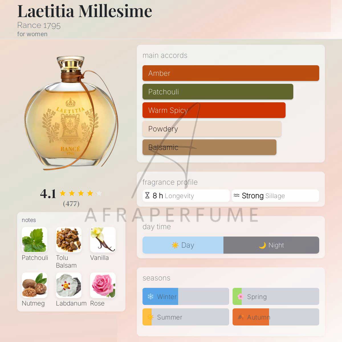 عطر ادکلن رنس لتیتیا میلسیم-Rance 1795 Laetitia Millesime برای فصول سرد سال مانند زمستان و پاییز مناسب می باشد.همچنین برای استفاده شبانه توصیه شده است.