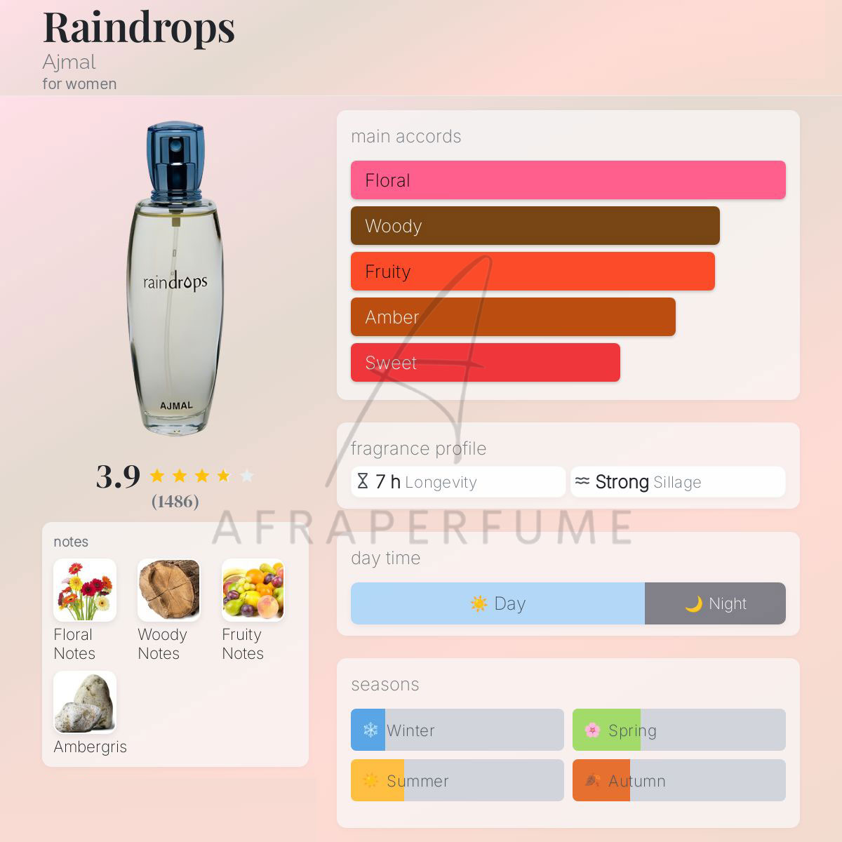 عطر ادکلن اجمل رین دراپس-Ajmal Raindrops عطری است شیرین.این عطر در سال 2006 به بازار عطر و ادکلن عرضه شد.عطر ادکلن اجمل رین دراپس-Ajmal Raindrops عطری است زنانه و جذاب.