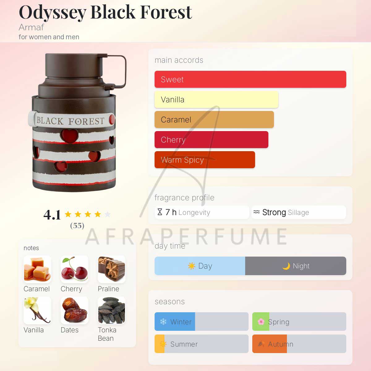 ادوپرفیوم اودیسی بلک فورست آرماف (Odyssey Black Forest Armaf) عطری است مرموز، پرحرارت و اغواگر که همانطور که از نامش پیداست، شما را به اعماق جنگلی تاریک و شیرین میبرد؛ جایی که گرمای ادویهها با نرمی کارامل و لطافت گیلاس در هم میآمیزد.