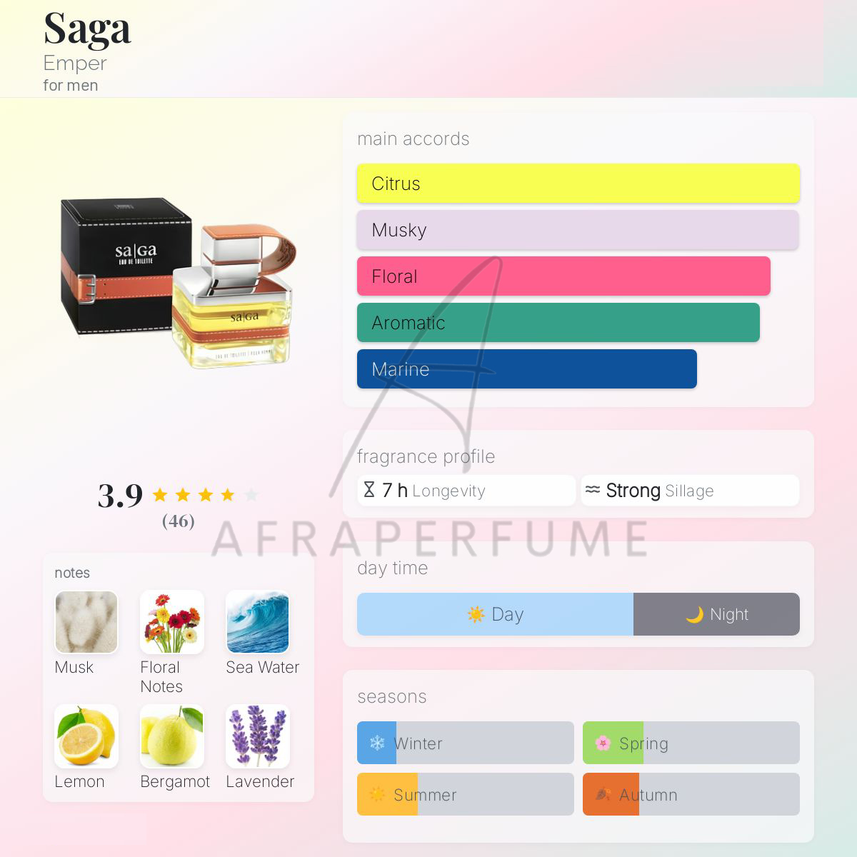 عطر ادکلن امپر ساگا مردانه-Emper saga for men، دارای رایحه ی خنک است که از این رو می تواند انتخاب عالی برای فصول گرم سال باشد. این عطر دارای رایحه ی غالبی از نت های دریایی و گلی ، فلفل صورتی و ترنج است.