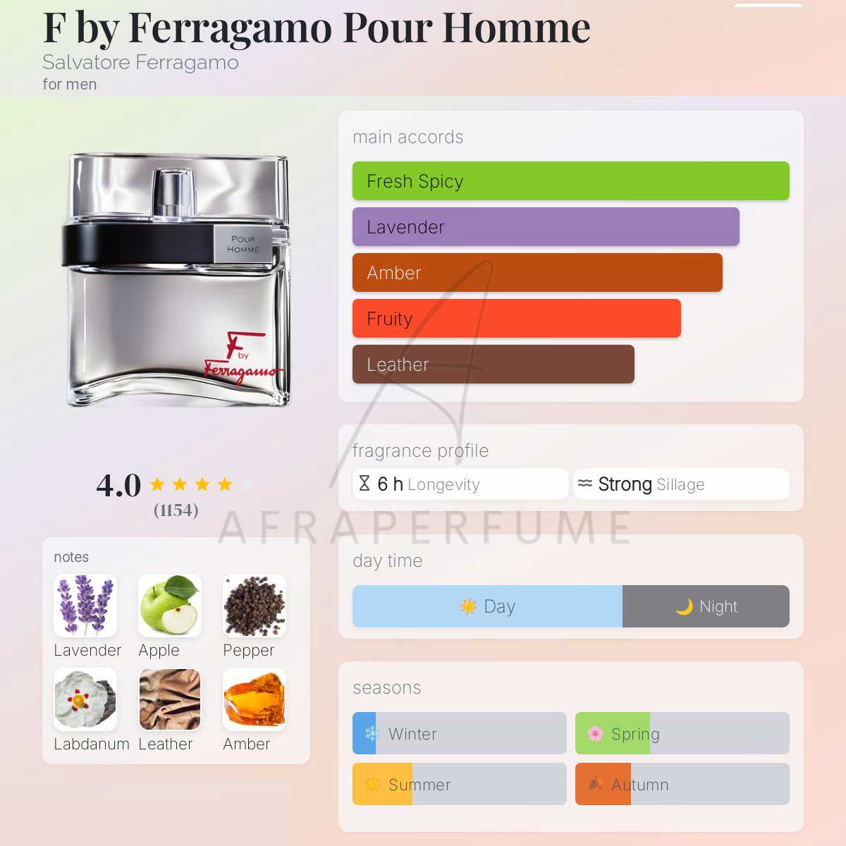 عطر ادکلن سالواتوره فراگامو اف بای فراگامو مردانه-Salvatore Ferragamo F by Ferragamo Pour Homme ،توسط شخصی به نام Olivier Polge خلق شد عطری است خنک و در عین حال فلفلی و کمی گرم که با رایحه دوست داشتنی و شاداب اسطوخدوس و سیب سبز آغاز می شود که ترش و شیرین و گیاهی و سبز است. در کنار حس شاداب می توان حس گرم و فلفلی مانندی از فلفل صورتی و فلفل سیاه نیز استشمام نمود که عطر را تلخ و مردانه و بسیار شیک و جذاب می کنند. با گذر زمان فلفل تا حدی آرام گرفته و با اضافه شدن مشک عطر کمی نیز شیرین می شود اما حس کلی رایحه بدون تغییر باقی می ماند.