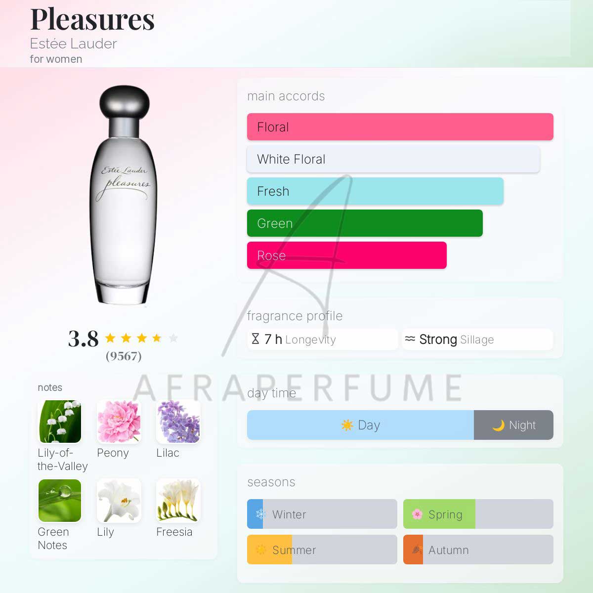 عطر ادکلن استی لودر پلیژرز زنانه-Estee Lauder Pleasures for women عطری است خنک و شیرین. این عطر در سال 1995 به بازار عطر و ادکلن عرضه شد. عطر ادکلن استی لودر پلیژرز-Estee Lauder Pleasures for women عطری است زنانه و خاص.